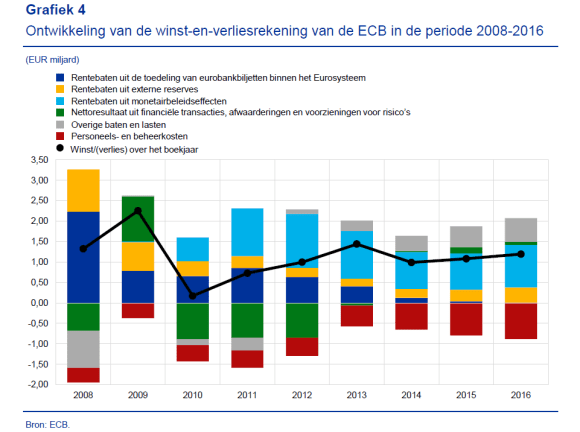 Hiernaast geeft de ECB aan dat haar ‘seigneuriage’ (de rentebaten uit de toebedeling van eurobankbiljetten binnen het ESCB, de blauwe blokjes) als gevolg van de dalende rente, van 2008 voortdurend daalt om in 2016 volledig onbestaand te zijn.