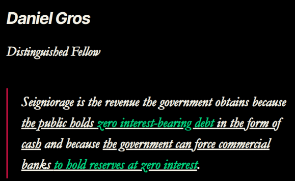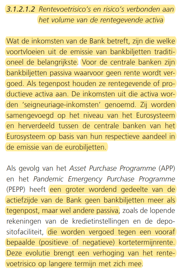 (..) Voor de centrale banken zijn bankbiljetten passiva waarvoor geen rente wordt vergoed. Als tegenpost houden ze rentegevende of productieve activa aan. De inkomsten UIT DIE ACTIVA worden “seigneuriage-inkomsten” genoemd.”