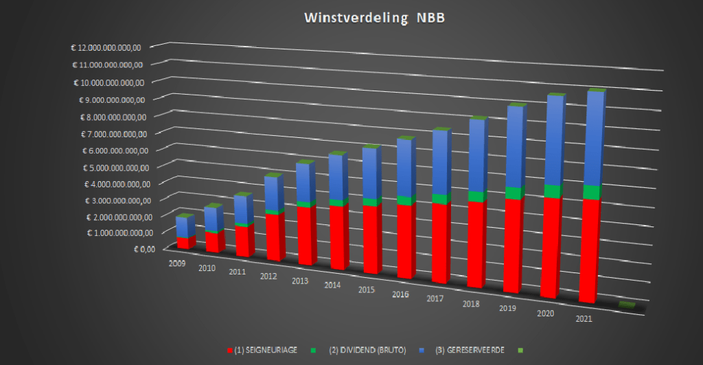 De Nationale Bank van België heeft van 2009 tot 2021 voor 11,02 miljard euro jaarwinsten gerealiseerd. Daarvan werd niet minder dan 5,54 miljard euro (50,26%) uitgekeerd aan de Belgische Soevereine Staat.