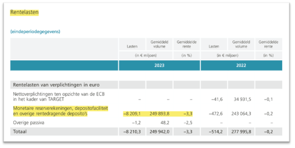 Blijkbaar toch wel? De seigneuriage is vanaf het boekjaar 2016 tot en met 2021 onbestaande geweest, maar de Europese Centrale Bank licht het in haar jaarverslag (boekjaar 2023) toe dat: de basisherfinancieringsrentevoet is gestegen van gemiddeld 0,6% in 2022 naar 3,80% in 2023 (4,50% eind 2023), en bijgevolg zijn de rentebaten uit de toebedeling van eurobankbiljetten binnen het Eurosysteem (de groene balkjes) gestegen van nul euro (2021) over 736 miljoen euro (2022) naar niet minder dan 4,817 miljard euro over het boekjaar 2023.