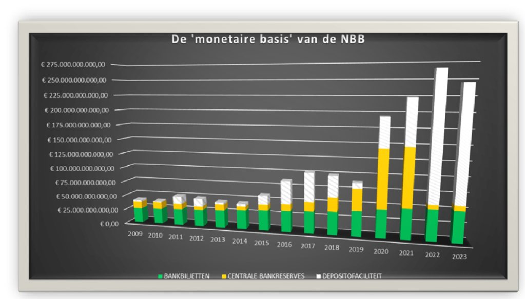 Er zijn slechts TWEE componenten die tot “de basislaag” behoren (en KUNNEN bijdragen tot de seigneuriage), en men wil het doen overkomen dat deze betrokken financieringsmiddelen in DRIE totaal verschillende passiefbalansposten geboekt staan? Immers: de schulden geboekt in de balanspost “2. Depositofaciliteit” zijn toch ook “verplichtingen jegens kredietinstellingen”?