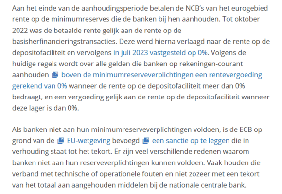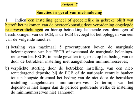 - De centrale banken kunnen de commerciële banken VERPLICHTEN om bij de centrale bank reserves aan te houden. De centrale bank bepaalt naar eigen inzicht de omvang van die verplichte reserves, heeft de macht om geen (of een absoluut geringe) rentevergoeding aan deze reserveverplichtingen toe te kennen, en is bevoegd om op grond van EU-wetgeving zware sancties op te leggen wanneer commerciële banken niet voldoen aan de opgelegde verplichtingen.