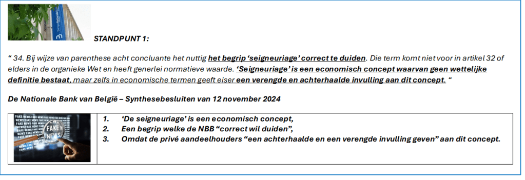 De “argumentatie” van de Nationale Bank van België gaat, bij de bepaling van het begrip ‘de seigneuriage’ (en de “logische gelijkstelling” met ‘het netto monetair inkomen’), voorbij aan twee fundamentele feiten. Minstens aan deze twee: