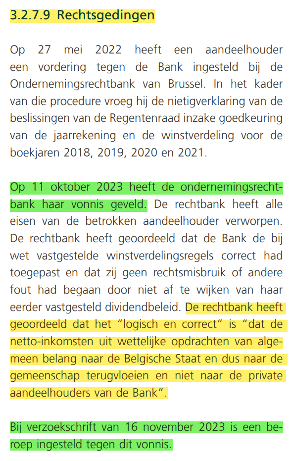 In een gerechtelijke procedure voor de Nederlandstalige Ondernemingsrechtbank van Brussel heeft de NBB gemeend om (in allerlaatste instantie) de rechtbank te moeten informeren dat ‘de seigneuriage’ NIET het deel van de winst is die de centrale bank kan realiseren uitsluitend uit de belegging van haar aandeel in de globale bankbiljettenomloop van het ESCB, maar deze ‘seigneuriage’ WEL zou overeenkomen met het volledige netto monetaire inkomen (en zelfs “het saldo van de totale jaarwinst” zou kunnen zijn) ?