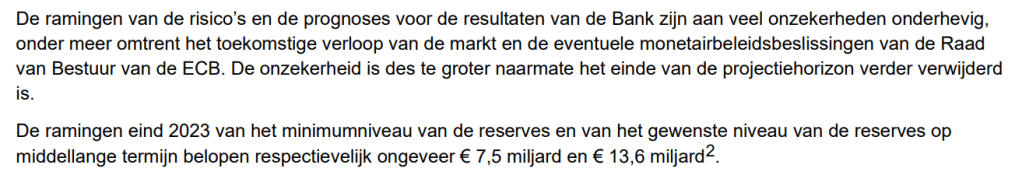 - de Regentenraad bepaalt de resterende financiële buffers op 3,10 miljard euro, en de “gewenste minimale reserves” noodzakelijk om het hoofd te bieden aan de “moeilijk inschatbare risico’s”, op 7,5 miljard euro. De Regentenraad verwacht de komende 5 boekjaren een gecumuleerd verlies van 6,10 miljard euro en indien de werkelijke verliezen niet belangrijker worden dan de geraamde financiële risico’s, dan zou de vennootschap nog altijd met een negatieve kapitaalpositie van niet minder dan 3,0 miljard euro achter blijven?!