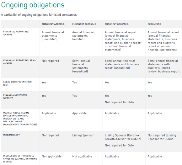 Euronext stelt criteria in om een notering op deze markten te kunnen verkrijgen. Verplichtingen waar de vennootschap moet aan voldoen op het moment dat zij een notering aanvraagt, naast de blijvende verplichtingen zolang zij deze notering wil aanhouden: