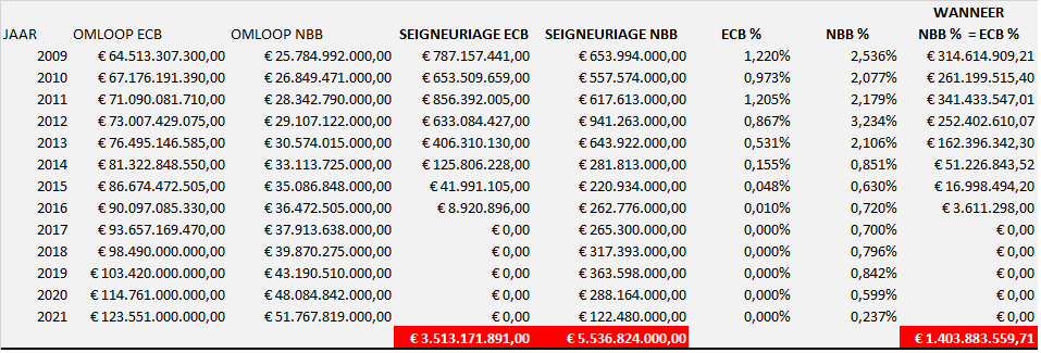 Had de Regentenraad toch een “correcte seigneuriage” betaald, maar bepaald volgens de methode van het ESCB (maar nog steeds zonder verdeling met de centrale bank?), dan was de Statutaire Portefeuille netto toch nog 3.398.018.424,92 euro groter geweest dan nu het geval is.