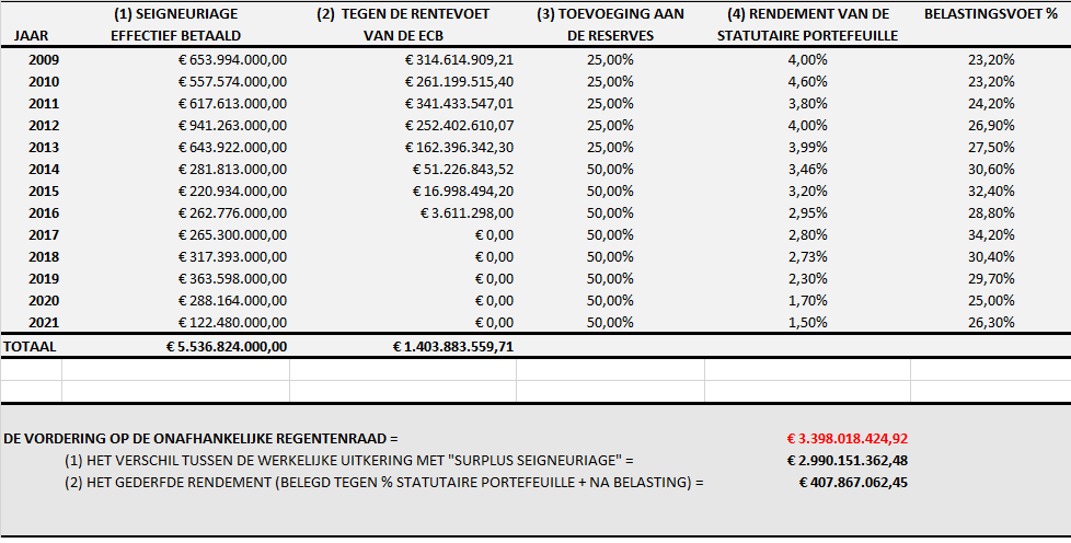 Het is duidelijk dat, indien de Regentenraad haar jaarlijkse seigneuriage-inkomsten telkens tegen dezelfde rentevoet van de ECB had bepaald, en zelfs al had zij deze seigneuriage-inkomsten integraal (zonder enige verdeling tussen de centrale bank en de Soevereine Staat) uitgekeerd aan de soevereine Belgische Staat,