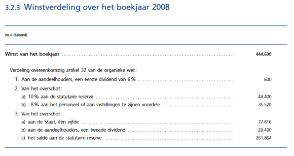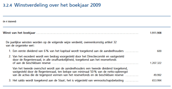 “De cascade in de aanwending van het resultaat (…) en pas in laatste instantie toewijzing van het saldo aan de Staat garandeert aldus dat de financiële belangen van de instelling zelf, van haar aandeelhouders en van de soevereine staat allen op een evenwichtige wijze aan bod komen.