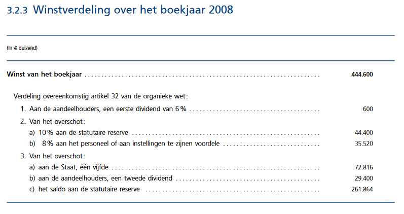 - Na eerste winstbestemmingen (eerste dividend en 10% reservering en toekenning van 8% aan het personeel) werd aan de Belgische Soevereine Staat PRIORITAIR 20% van de resterende jaarwinsten afgestaan,
