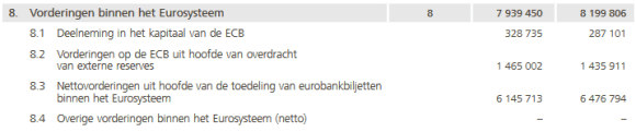 Deze posities (vorderingen of verplichtingen) worden verantwoord onder de post ‘Netto vorderingen/verplichtingen uit hoofde van de toedeling van eurobankbiljetten binnen het Eurosysteem’.
