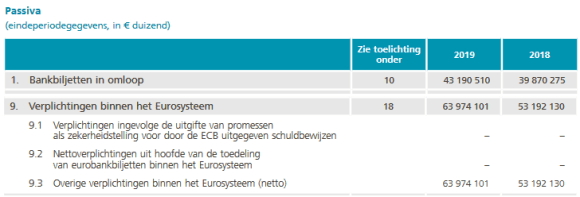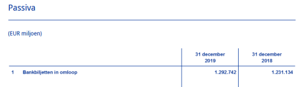 Op haar eigen balans dus, als passiefrubriek “1. Bankbiljetten in omloop”: