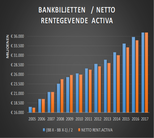 Volgende twee toelichtingen uit verschillende jaarverslagen van de NBB tonen de effectieve samenhang aan tussen “de netto rentegevende activa” en de bankbiljettenomloop, als de basis voor de berekening van de te verdelen seigneuriage: