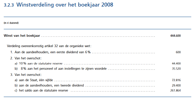 Beide evoluties werden ingeschat zich te zullen doorzetten, wat ook is gebleken. De vennootschap had deze toenemende component van haar totale winsten (als dividenden) kunnen uitkeren aan haar eigenaars, doch in dat geval had de Staat deze inkomsten moeten delen met de 50 % particuliere aandeelhouders.