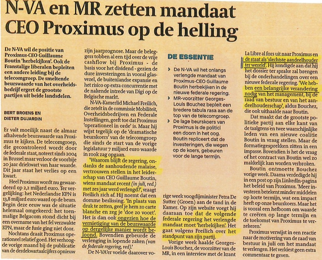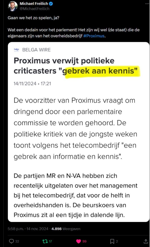 Deze vaststellingen vanwege de media worden overgenomen door volksvertegenwoordiger Michaël Freilich. Hij stelt zich terecht de vraag waarom de bevoegde Minister en de regering beslisten om het mandaat van de CEO van Proximus met zes jaar te verlengen, gezien het dramatisch slechte beleid.