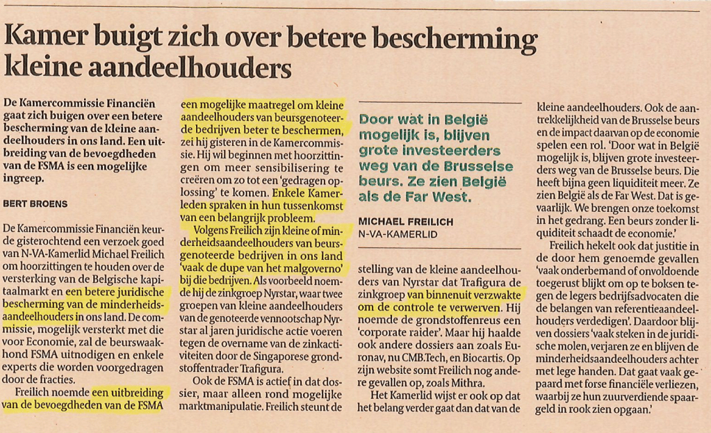 In De Tijd van 27/11/2024 zouden “enkele kamerleden het in hun tussenkomst als een belangrijk probleem” hebben benoemd, en zouden die minderheidsaandeelhouders van beursgenoteerde bedrijven “vaak de dupe zijn van malgoverno” …