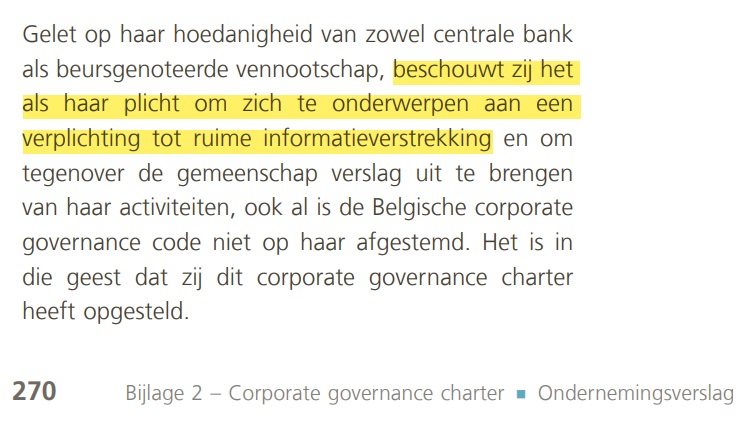 Desondanks beschouwt ook de Nationale Bank van België, met haar eigenlijk onbetwistbare voorbeeldfunctie, het tot haar plicht om zich te onderwerpen aan een verplichting tot ruime informatieverstrekking.