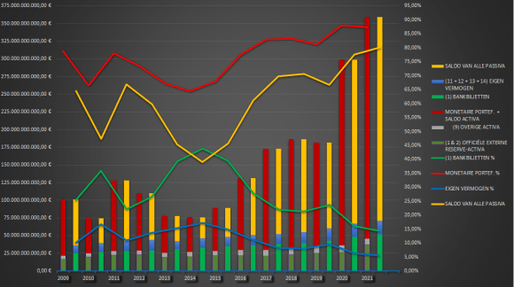 Voor elk boekjaar worden de activa en de passiva naast elkaar geplaatst. Het mag duidelijk zijn dat de sterke aangroei van de monetaire portefeuilles (de rode balkjes) nagenoeg volledig werd gefinancierd NIET via renteloze bankbiljetten (groene balkjes), doch WEL via de vergoede centrale bankreserves (oranje balkjes).