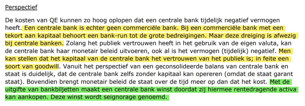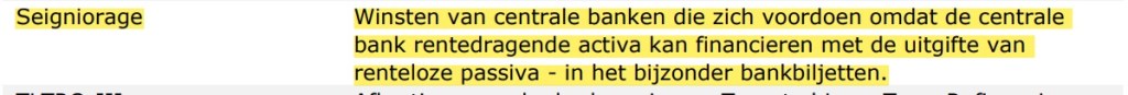 Het eigen vermogen is het vertrouwen in de centrale bank, de ‘seigneuriage’ is de winst verkregen door de uitgifte van renteloze bankbiljetten …