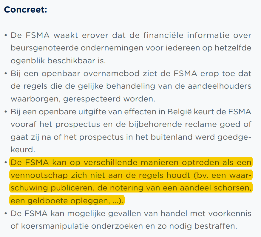 En ook nu weer moeten die minderheidsaandeelhouders vaststellen dat een toezichthouder, verondersteld toch extra waakzaam en zeker onafhankelijk te zijn, duidelijk aarzelt om zoals beloofd daadkrachtig op te treden. Zelfs in een (via onverantwoorde vermogensafdrachten) gecreëerde dramatische financiële situatie lijkt die toezichthouder FSMA, rechtstreeks afhangend van de Minister van Financiën (eveneens vertegenwoordiger van de Belgische Soevereine Staat), niet alle beschikbare middelen te gaan inzetten om deze misdaden te stoppen, om de handel op financiële markten eerlijk te laten verlopen.