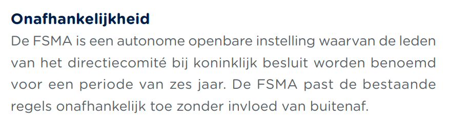 - Hoe onafhankelijk toont FSMA zich hier, wanneer zij zegt krachtdadig te kunnen en zullen optreden, maar het hier duidelijk NIET wil doen? Kan er dan toch sprake zijn van enige invloed “van buitenaf”?