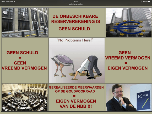 - doch nog altijd moeite heeft om het ook uitdrukkelijk als effectief eigen vermogen te benoemen? En tegelijkertijd in de toelichtingen van haar jaarverslag blijft stellen dat de goudvoorraad (en de andere externe reserve-activa) eigendom zijn van de Belgische Staat?!!